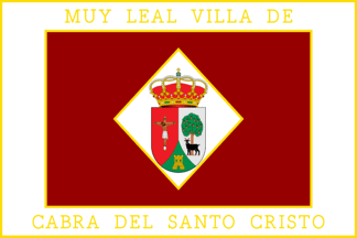 Description: “Rectangular taffeta flag, with a ratio of three modules long by two modules wide (2/3), or in other words, one and a half times longer than wide, the cloth dyed in crimson red, edged in gold, bordered by a white edge (as a heraldic border), which bears at the top of the length, the motto in gold capital letters: Very Loyal Town of, while at the bottom of the same length, the motto also in capital letters and in gold: Cabra del Santo Cristo. The field of the flag bears in the center a white lozenge with right angles, inside which will be fully charged the coat of arms of Cabra del Santo Cristo described above, without the motto, adjusting the geometric axis of this to the center of the vexillum, with a height equal to two-thirds of the width of the flag.”