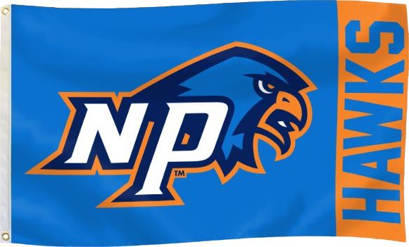 The flag of SUNY New Paltz, based on a photograph I found on the school's website, appears to focus on the name of the school printed on a dark blue field. Across the center of the field are adjacent stripes of white above orange, though the stripes are truncated before the reach either the hoist or fly edges. In large, capital, orange letters are the words "NEW PALTZ", while the words "STATE UNIVERSITY OF NEW YORK" appear in the same color and font, only smaller, above "NEW PALTZ."