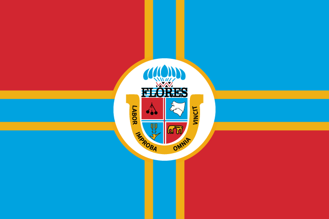 The flag of the Flores Department was adopted through Decree No.055 on 13 May 1987 after a contest for the creation of one in which 74 works were received. The design (first-place winner) was created by Ernesto Dámaso Quintero of the capital Trinidad. The design of the flag is: four fields, two red (upper-left and lower-right) and two sky blue (upper-right and lower-left) with the coat of arms of the department in the center over a white oval. A golden outline of a cross is in its background, having as its main color sky blue. The central oval is outlined in gold. It does not appear the decree is publicly available online. Clearly, the flag is created to follow the same format as the coat of arms.