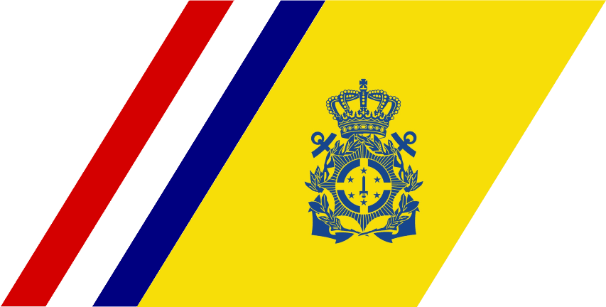 Its flag is yellow with its coat of arms placed at hoist side of the flag. Three diagonal stripes of Dutch national colors are placed at fly.