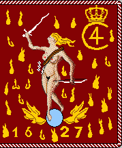 The flag is dark red semy of little flames Or of different shape. The central charge is Nike,the Goddess of victory, naked with a bow and a sword flamant, both Argent, and a quiver with three arrows with white feathers. She stands on a blue globe winged Or. On base is a golden number "1627". On upper fly is the golden cypher "C4" of the king. The standard has silver and dark red fringes at three edges.