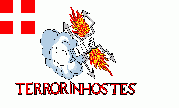 The ratio is approximately 3:5. The flag is white with a Dannebrog in canton. The central charge is a white armed arm coming out of clouds of greyish blue, holding four grey thunderbolts and two flames proper. Beneath is an inscription in red initials "TERROR IN HOSTES" (= (put) fear into the enemies).