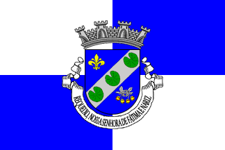Shield Azure on a bend sinister Argent three water lily leaves Vert, in dexter chief a fleur de lis Or, in sinister base a cherry twig Argent fructed Gules garnished Or. Mural crown Argent with four visible towers (town rank) and white scroll with inscription in black capitals "REQUEIXO, NOSSA SENHORA DE FÁTIMA E NARIZ".