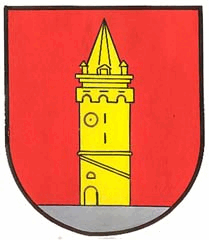 The coat of arms, granted since 1951, is dominated by the so-called "Türkenturm" (Turk Tower). The defensive tower, a remnant of the former town fortifications, was built in the first half of the 17th century, at the time of the Turkish sieges. It also symbolizes the market's jurisdiction (photo, source).