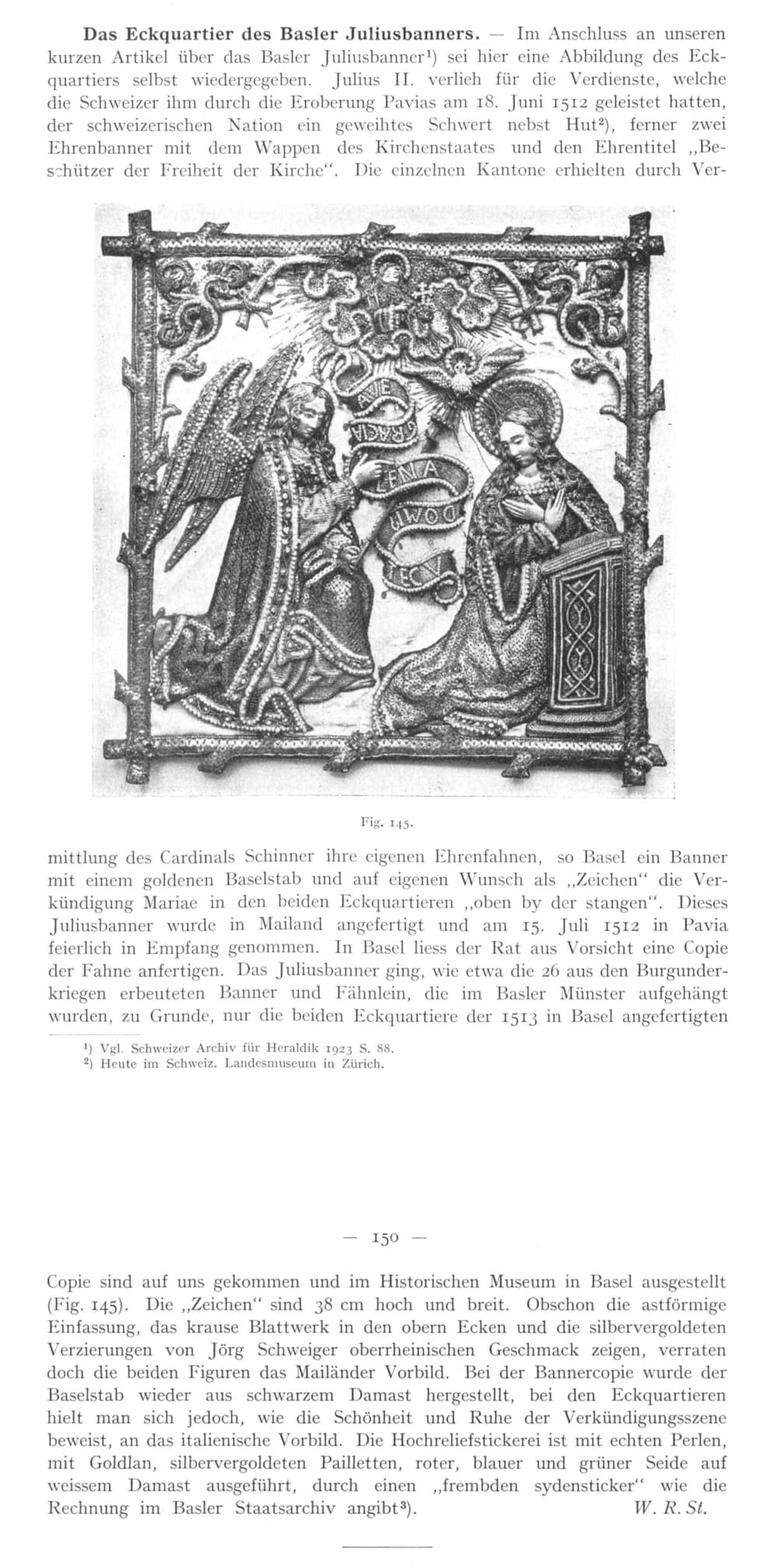 • Zwickelbild of Basel's Julius Banner (1512), showing the Annunciation to Mary. This is from a copy of the banner which was used for battles. This banner and the original banner are lost. Location: Historical Museum, Basel | Article in Schweizerisches Archiv für Heraldik, 41/1927, German