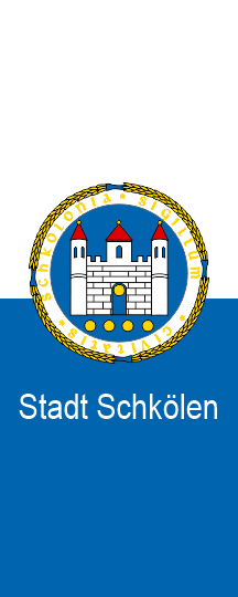 It is a white-blue horizontal bicolour. The city seal is slightly shifted towards the top. Under the seal is a white inscription "STADT SCHKÖLEN".