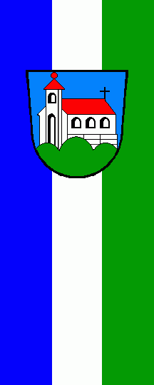 It is a blue-white-green vertical tricolour. The coat of arms is shifted towards the top.