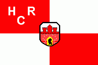 It is a quarterly divided red and white flag with white capital letters "RCS" in the lower fly and the coat of arms of the former city of Harburg in the upper hoist.