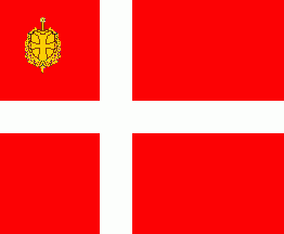 The red flag is parted by an off-centred white cross. In canton is the golden badge of the brigade, a shield parted by a cross patty, surrounded by a wreath and superimposing a sword in pale. The colour of department was approved on 21 September 2006. Before it belonged to the Danish International Brigade (DIB) (Danish: Den Danske Internationale Brigade)
