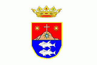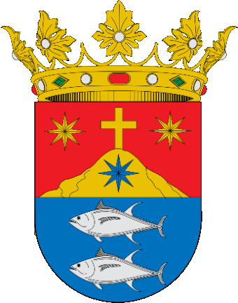 Coat of arms: Per fess [fimbriated or], 1. Gules a mount or ensigned by a cross of the same [brown on the images] charged with a star azure and surrounded in chief in two stars or [brown on the images]. 2. Azure two tunas argent per fess. The shield surmounted by a Duke's coronet.The upper field shows the modified emblem of the Carmelites, featuring Mt. Carmel and the stars referring to Our Lady of Mount Carmel. The tunas recall the almadraba fisheries, shown on Phoenician coins (see Adra).