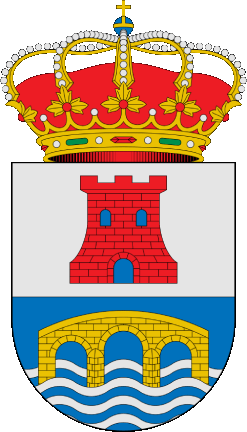 Description: Shield divided per fess. First, argent, a tower gules. Second, azure, a bridge or, supported by waves argent and azure. Crest: a closed royal crown.