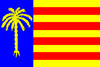 The flag is almost a banner of the arms (blazoned Per pale Azure a palmtree Or and Or four pallets Gules). The palmtree is the attribute of St Christopher, the local patron saint, and the yellow-red stripes remind of the former royal jurisdiction. Flag adopted 21st October 1991. Source for image and text: Fluvià 2001.