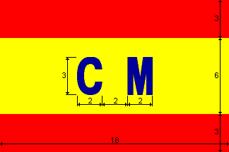 The ensign for mail vessels, adopted in December 1945, was a national flag with the coat of arms replaced by the blue letters "CM" (for Correo Marítimo, Maritime Mail), centred on the yellow stripe. The height of the letters is 1/4 the flag's height while their width is 1/6 the flag's width; the letters are separated by a distance of 1/6 the flag's height.