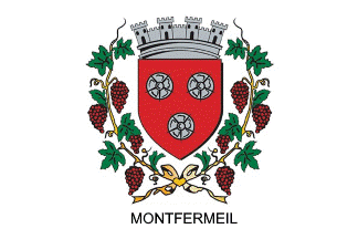 The arms of Montfermeil are "Gules three roses argent". The shield is surmounted by a four-towered mural crown argent and surrounded by two branches of grapevine vert fructed gules tied per saltire by a scroll or.