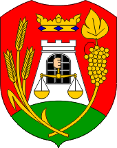 On the red background of a shield, on the top of a green mount, is standing a white conical tower with embattlements. In the centre of the tower is a window with silver crossbars from which is extending an arm holding golden balanced scales. Above the tower is a golden crown.
