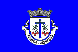 Shield Argent, an Egyptian cross Azure between two bunches of cherries Gules leaved Vert. Mural crown Argent with three visible towers (village rank) and white scroll with inscription in black initials: "RIBAFRIA - ALENQUER".