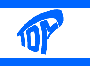 It is a squarish white flag, ratio between 3:4 and 5:7, with thin light blue stripes at top and bottom and a large light blue logo lettering reading "TOM" in fanciful serifless capitals shaped like a stylized ship hull.