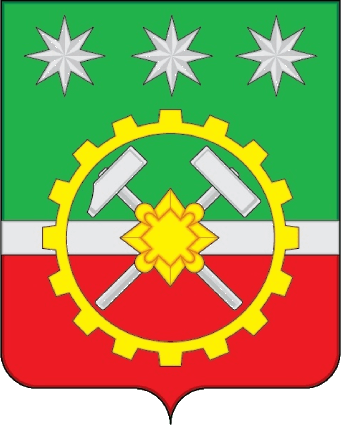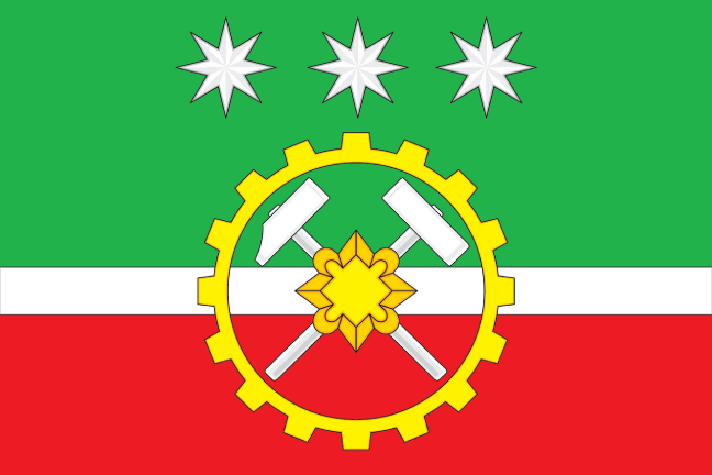In a green and gules field, divided by a lowered silver belt, above the belt is a gold rim of a cogwheel and inside it are silver hammers crossed, one with a narrow striker outward, the other with two wide strikers, and a gold stone (with four acute and four rounded angles alternately) above their intersection; at the head of everything is accompanied by three silver stars with eight rays.