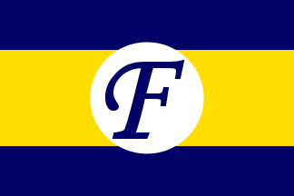 Part of the fleet is encountered on shipspotting sites, but I have found no photo of the house flag. Their homepage shows a drawing of it, though, which will have to do: horizontally divided dark blue-yellow-dark blue, in a 1:2:1 ratio it seems, a white oval in the centre partly extending into the blue stripes and on which is placed a dark blue stylized initial "F." What is more, the oval seems to lean to the right.