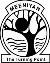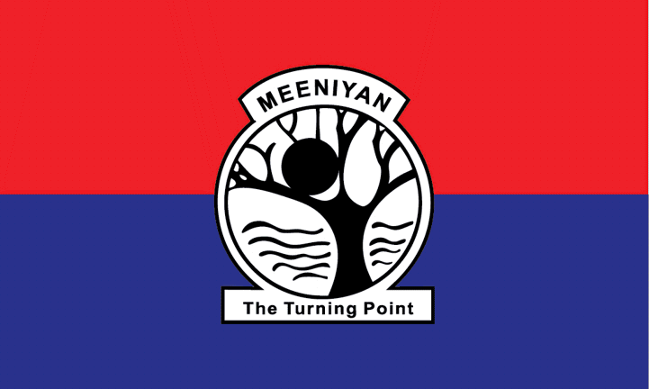 The flag of Meeniyan can be observed at the Meeniyan Town Hall. It is a horizontal bicolour, with red at the top, and blue at the bottom, with the logo of Meeniyan "The Turning Point" in white and black, on top of it (photograph).