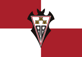 The official flag of Albacete Balompié is white with the club's emblem. On unofficial versions of the flag (photo, photo), the emblem is surrounded by the club's name written horizontally in yellow letters, "Albacete" on the left, "Balompié" on the right.