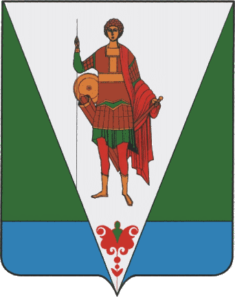 In a green field with an azure tip, above all, an inverted silver point, burdened with the Holy Great Martyr and Victorious George in the form of a young foot warrior upright in green clothing, purple, trimmed with gold, armor, scarlet cloak and trousers and gold boots, on whose belt on the right is a purple, trimmed with gold, quiver and, above it, a golden round shield coming out from behind the back, having in his right hand a golden spear placed in a column with the point upwards, and his left hand resting on the hilt of a golden sword in a scabbard hanging on his belt, accompanied below by a scarlet flower with a green stem.