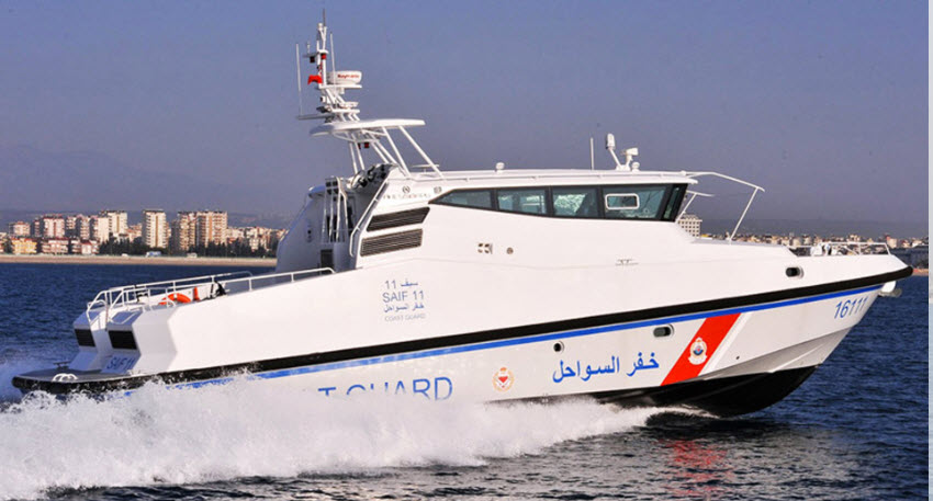 The Bahraini Coast Guard racing stripes used on the ARES 58 FPB Multi-Role Patrol Craft consists of a wider red (stern) and a narrow white stripe (nose) interrupted by a transparent part. The Coast Guard emblem is placed on the middle of the red stripe.