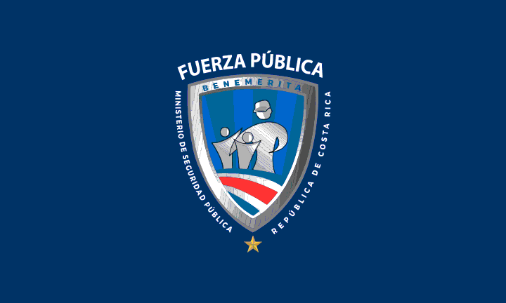 The flag has a navy blue field, having in the center the force's logo. It is a shield surrounded by the words FUERZA PÚBLICA (above); MINISTERIO DE SEGURIDAD PÚBLICA and REPÚBLICA DE COSTA RICA to the sides. Below the shield is a gold star; this text