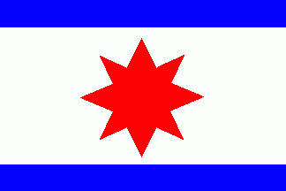 It is a white flag with horizontal blue stripes on both edges. In the white field is a red 8-point-star shifted to the hoist.