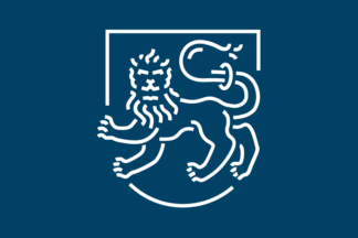 The flag is blue with a white logo, based on the arms, showing the lion in an adumbrated shield.