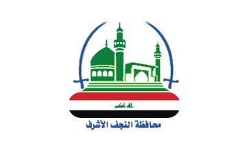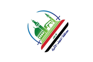The logo depicts a green gradient of the Imam Ali Holy Shrine with two blue swords having gradients to its sides, denoting the fact the Governorate has one of the holiest sites for Shia Muslims. In more modern versions, Arabic text is read underneath this logo and stylized in black; on older versions, the Iraq National Flag is depicted above the name of the Governorate in blue. These older versions are also still used to this day.
