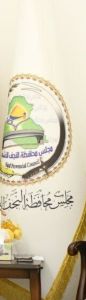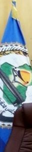The flag depicts the logo with its name underneath it in stylized Arabic. The elements are diagonally placed. This flag appears to have started being used in 2024.
