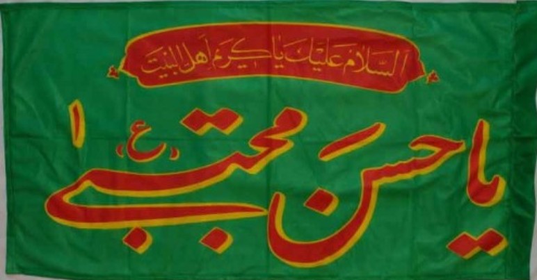 A green-field flag honoring the 7th and 9th Twelver Shia Imams; as seen at