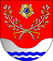 Shield Gules two olive branches Argent leafed Or in saltire and tied with a ribbon Or, on chief a heraldic rose Or seeded Argent and barbed Azure, issuant from flanches and from base wavy Azure, charged with a barrulet wavy Argent, a "valley" Argent. Mural crown Argent with three visible towers (village rank) and white scroll reading in black upper case serifed letters "VILARES - TRANCOSO".