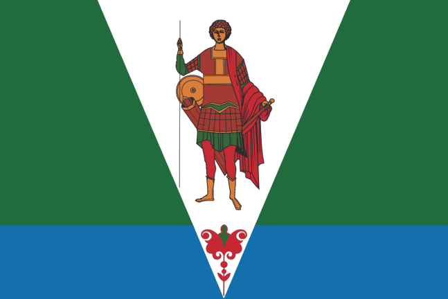 A rectangular cloth with a width to length ratio of 2:3, consisting of two horizontal stripes: the upper green stripe, 3/4 of the width of the cloth, and the lower blue stripe; in the center of the cloth is an inverted isosceles triangle of white color, the base of which is at the upper edge of the cloth and is 1/2 the length of the cloth, and the apex is at the middle of the lower edge of the cloth; in the center of the triangle is the Holy Great Martyr George the Victorious in the form of a foot warrior, standing straight, in red robes with green and yellow trim, yellow boots, with a black spear in his right hand, with a round yellow shield coming out from behind his back to the shaft, a red quiver on his right side and with his left hand placed on the hilt of an attached red sword. Below the figure is a scarlet flower with a green stem.