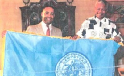 I found the above image of the flag of the Village of Hempstead while browsing the web. It is a light blue field with the village seal in the middle. How it came to be in Nelson Mandela's hands I cannot say for sure- I cannot find any accompanying text to go with it. But it was part of a website of an HIV activist who separately mentions visiting Hempstead and meeting the mayor and visiting with Mandela, so there is probably some sort of logical explanation. The flag has a field of light blue and bears a light blue & white rendition of the village seal in the center. A differently colored version of the seal can be seen at www.villageofhempstead.org/.