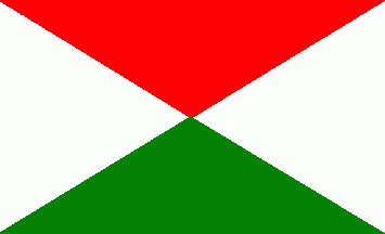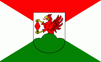 The flag's ratio is 3:5. The flag is divided per saltire into white (hoist and fly), red (top) and green (bottom). The coat of arms is in the centre of the flag.