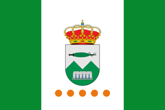 Description: Rectangular flag composed of three vertical stripes, green on the outside and white on the outside, and of double width, the central one bearing the municipal coat of arms and below it five orange circles.