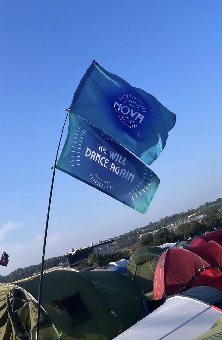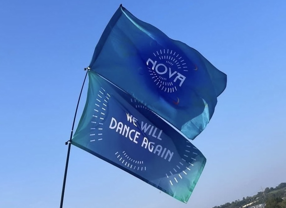 The light-blue-field flag of the "Nova" music festivals that are promoted by the Tel Aviv based "Eventer Company", ca. Oct. 2023. In the middle of the flag is the Nova logo: with the word "Nova" surrounded by short white lines/rays figuratively symbolizing a star exploding in space. Also on the flag, surrounding the logo, there are at the left two crescent moons that are a "pale white/light blue" color, while the right two crescent moons are a "sunrise" red-orange color. A Nova is a sudden increase in brightness of a star before shrinking back down to normality. More powerful than a nova, a supernova is an explosion that heralds the demise of a star.