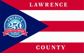 The flag seems to be a simple white cloth with the county's seal in it, probably centered. The seal contains the words "LAWRENCE COUNTY / STATE of OHIO" in the outer ring and four elements in the central area: a branch with a couple