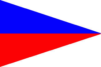 It is a white pennant with a shield shifted to the hoist. The shield is divided per bend sinister into red with a yellow scallop upon the dexter chief and plain yellow cotized red and yellow.