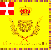 The guidons were swallow tailed with golden fringes. On centre was the golden dual cypher of the king, reading "F4", surmounted by a royal crown.