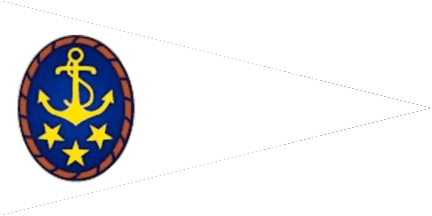 The pennant is white. Shifted to hoist is a blue oval bordered by a rope of white and red. On the oval is an anchor with rope in pale above and three stars ordered 2:1 below, all yellow.
