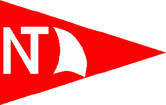 The pennant is blue. Shifted to hoist on a white disc is a red steering wheel charged with red initials "NB" (see left image above).