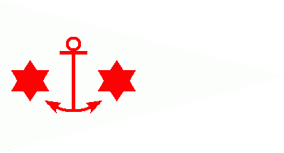 The pennant is white. Shifted to hoist is a red anchor in pale between two red 6-point stars.
