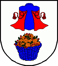 Shield Argent, on chief a coat Gules with cords of the same and lining Azure, on base a basket Azure filled with agricultural products proper.