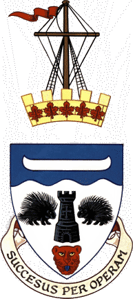 Argent a tower between two porcupines passant respectant Sable and in base a lion’s face Gules, on a chief wavy Azure a canoe Argent