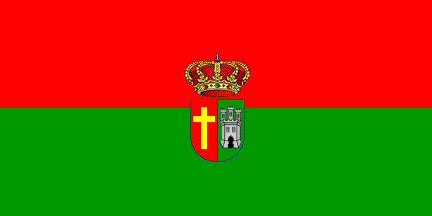 Flag: [...] rectangular, extending from the side closer to the hoist to the fly with a length double of the width, horizontally divided into two equal parts, the upper, red, and the lower, green. In the center, with its geometrical axis fitted to the center of the flag, the coat of arms, crowned with a Royal Spanish crown.