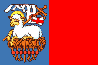 Blue at hoist, with the Paschal Lamb positioned on the Book of the Seven Seals, all in their conventional colors. Red at the fly.