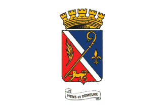 The flag of Gasny (photo) is white with the municipal coat of arms, "Per bend azure and gules debruised by a a bendlet argent disjoined abased at senester a crozier or per bend overall between a palm branch contourned at dexter a fleur de lis at senester and a leopard in base all or.